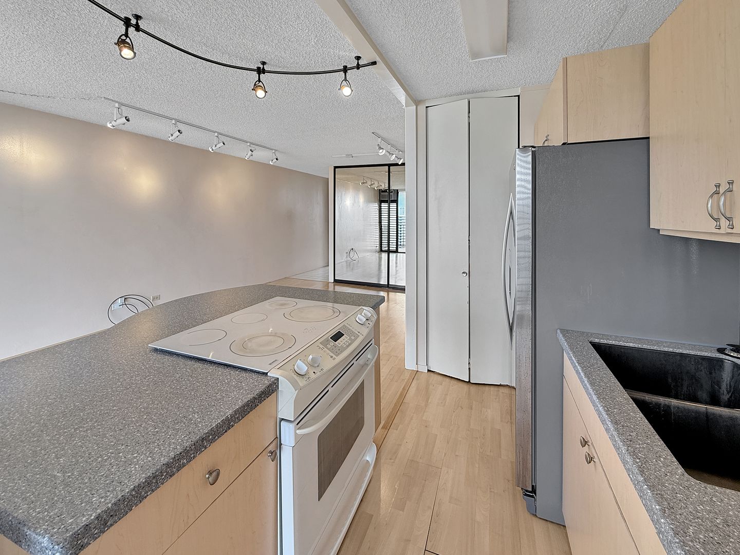 The chef’s kitchen offers abundant cabinetry, Corian countertops, an eat-in breakfast bar, and the convenience of an in-unit washer and dryer. The bedroom includes a full-size closet, plus an additional closet in the living room for extra storage, with easy access to the bathroom.