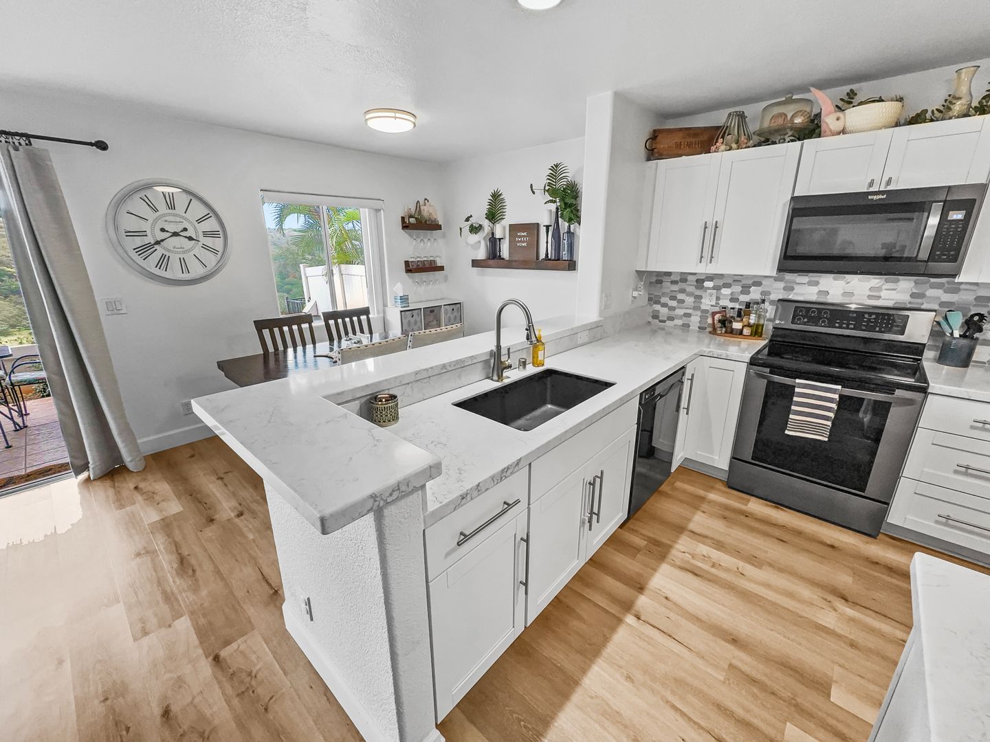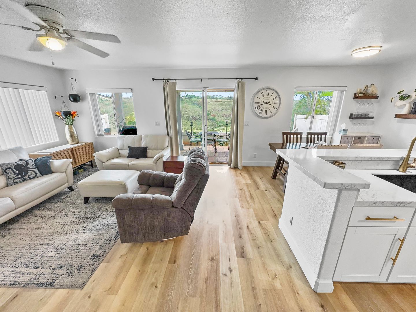 Situated a rim lot with amazing views is this gorgeous attached family home! Inside you'll find luxury plank vinyl floors a remodeled chef's kitchen with plenty of cabinet space, stainless appliances, quartz countertops and a huge eat in bar! The open concept kitchen overlooks the living and dining areas with sliding glass doors that opens your private covered lanai! Just look at the views!