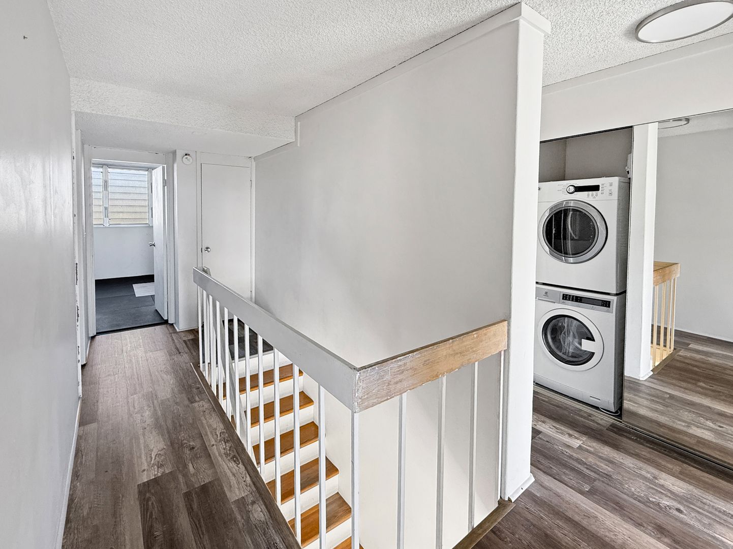 One covered parking stall included, street parking available, full size washer dryer in unit.