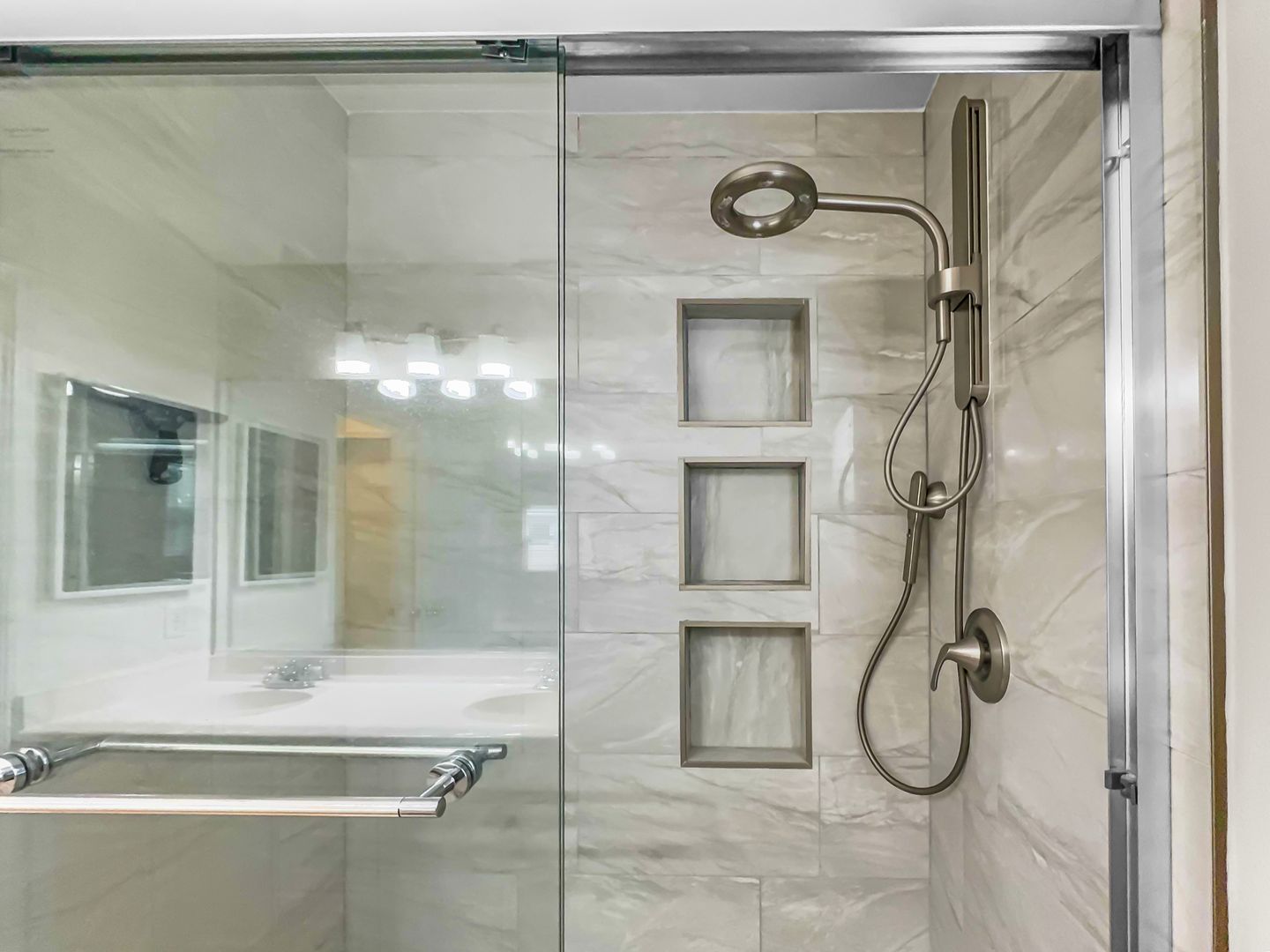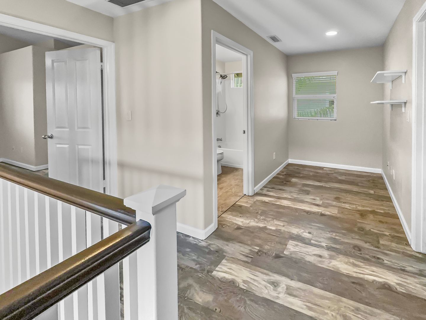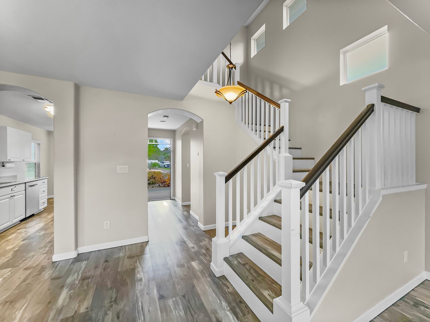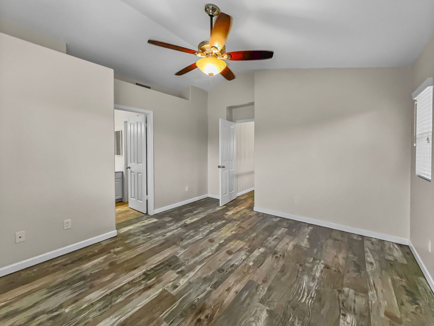 Upstairs, the spacious primary suite impresses with vaulted ceilings, a private ensuite bath, and a generous walk-in closet. Two well-proportioned guest bedrooms feature full-size closets and share a hallway bathroom, complemented by a large alcove—perfect for a home office, reading lounge, or flex space.