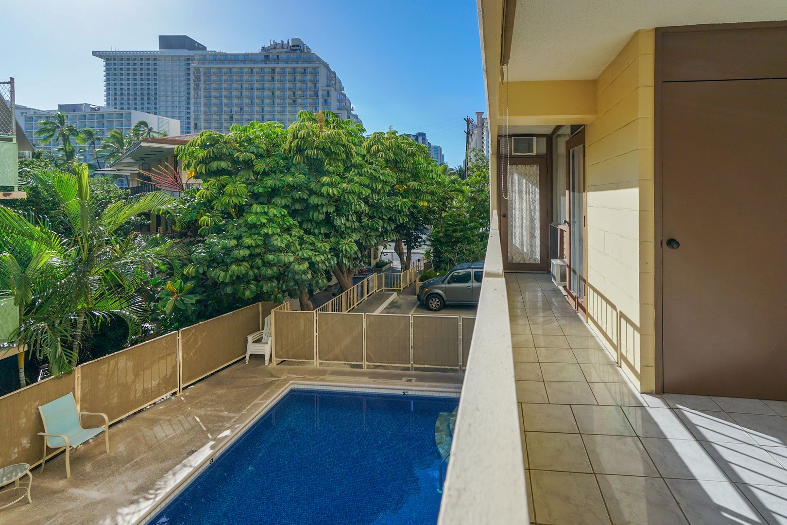 Located in the BEST part of Waikiki & two blocks from Waikiki Beach! Beautifully renovated 2 bedroom condo has a wonderful living room with AC that opens onto your covered lanai that over looks the saltwater pool. The chef's kitchen has granite countertops with tons of storage! The first bedroom has AC, ceiling fan and opens onto the lanai. The primary suite has lots of light, a walk in closet, AC, ceiling fan and access to the lanai. The unit has a washer dryer in unit and includes 1 parking stall #2.