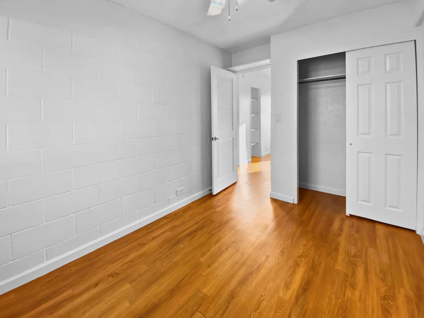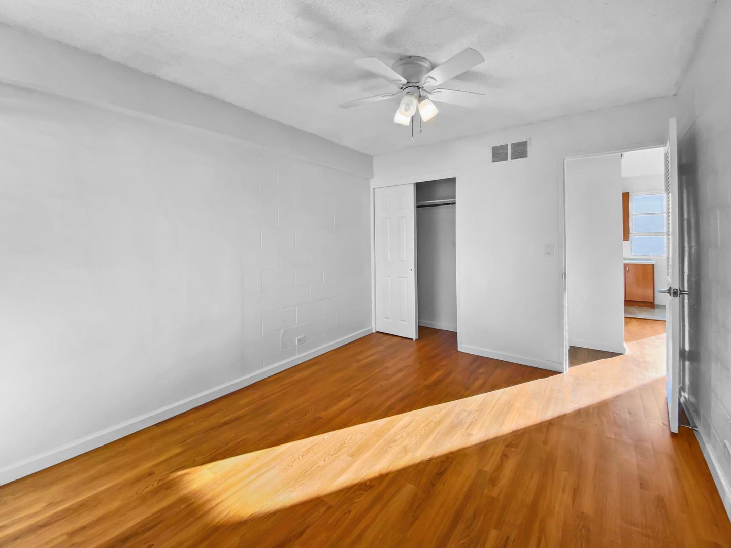Primary bdrm has full size closet and its own large lanai to chill on. Both bedrooms have AC and ceiling fans and share a renovated hall bathroom.