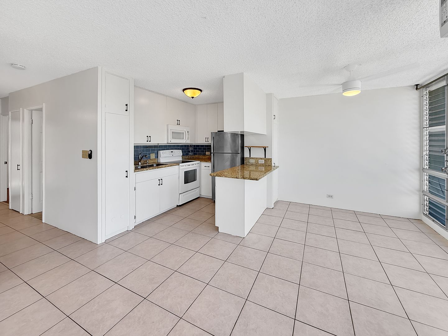 Welcome to Hale Pumehana! This beautifully renovated pet friendly 2 bedroom 2 bath condo has it all! Inside you'll find a large living and dining area, cool tile and luxury vinyl plank flooring, fresh paint, ceiling fans and AC! The big glass sliding door opens onto a large covered lanai with sweeping city and ocean views! The chef's kitchen has granite countertops, modern appliances, plenty of storage plus a breakfast bar!