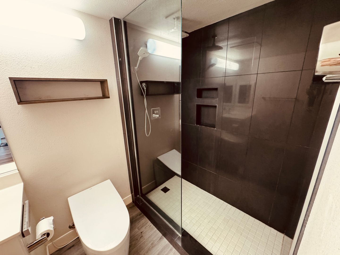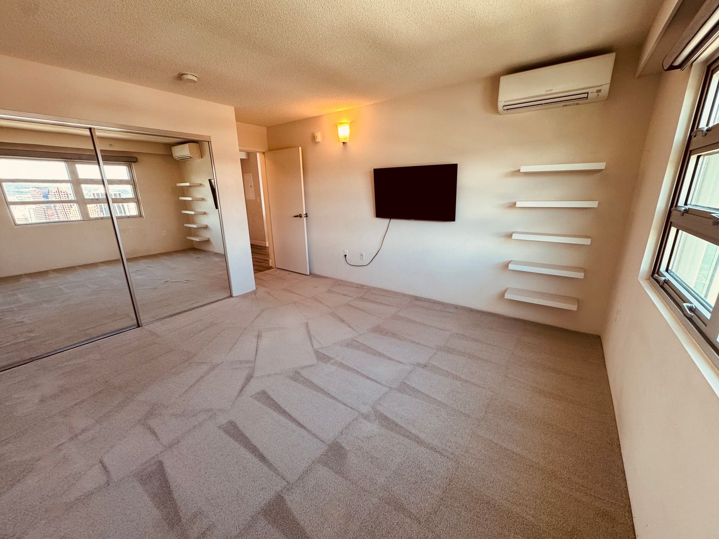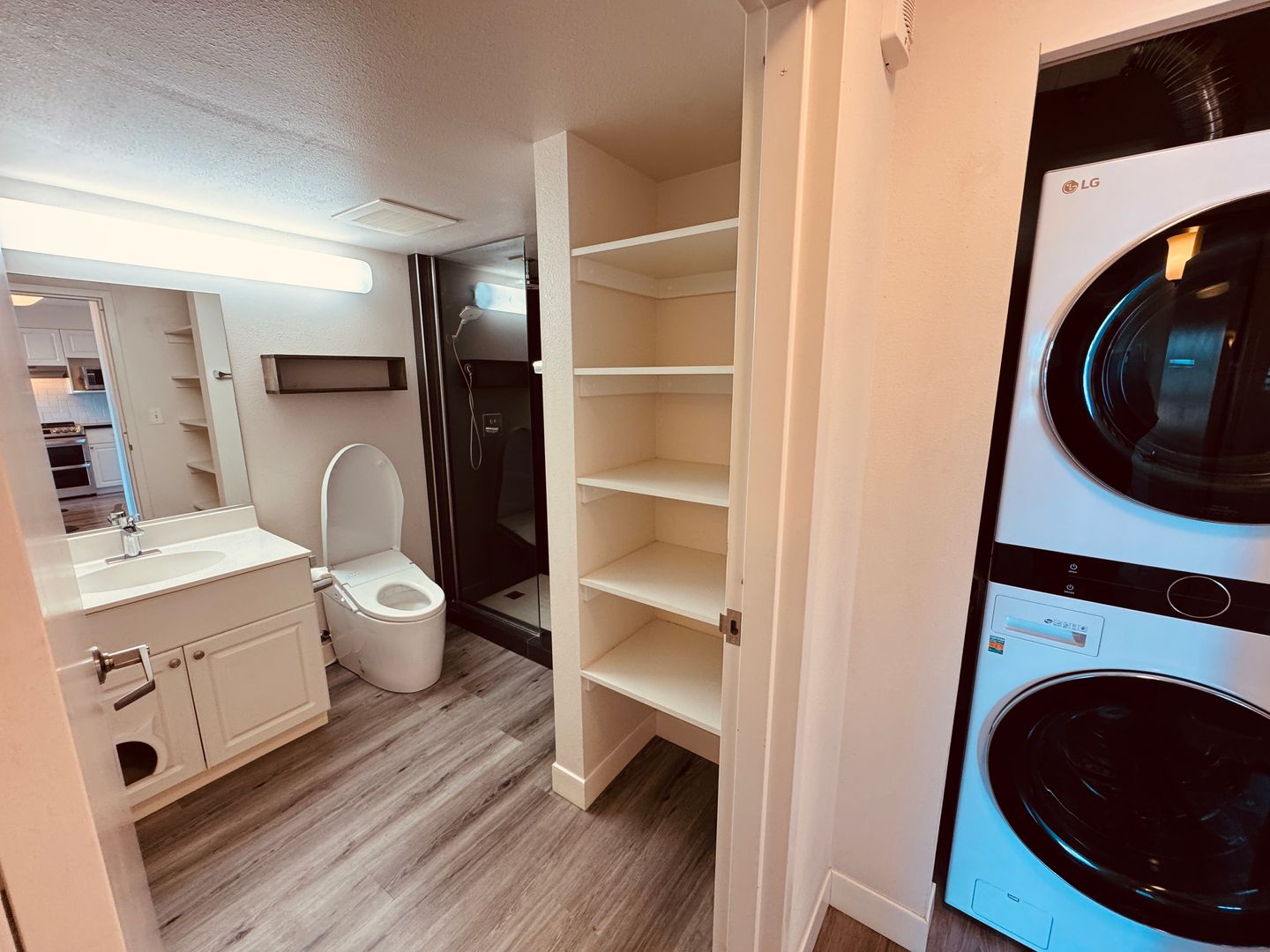 Another wonderful feature is the balcony overlooking the city. The primary suite offers abundant natural light, a spacious custom closet and AC. Just outside the door is the full size washer & dryer and a well-appointed bathroom that includes a Toto toilet.