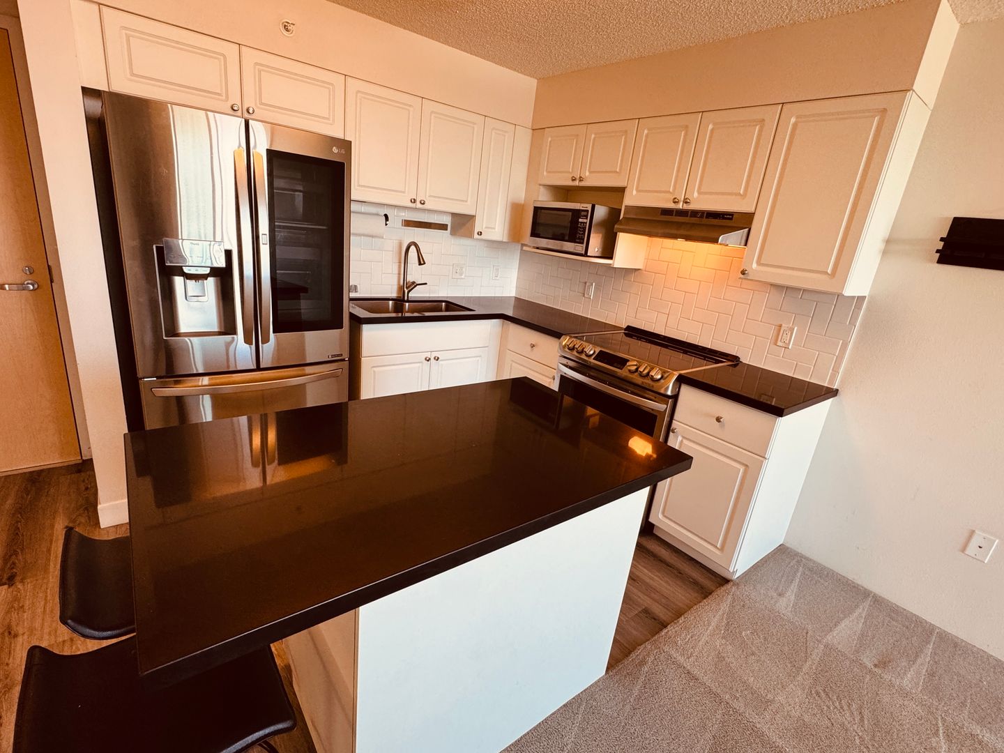 The thoughtfully designed chef’s kitchen features sleek solid-surface countertops, modern cabinetry, upgraded stainless appliances, and a convenient island breakfast bar—ideal for both everyday living and entertaining. The open-concept living and dining area is enhanced by a custom wine wall, AC, and a plush carpet.