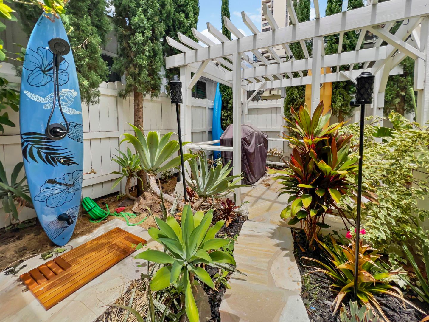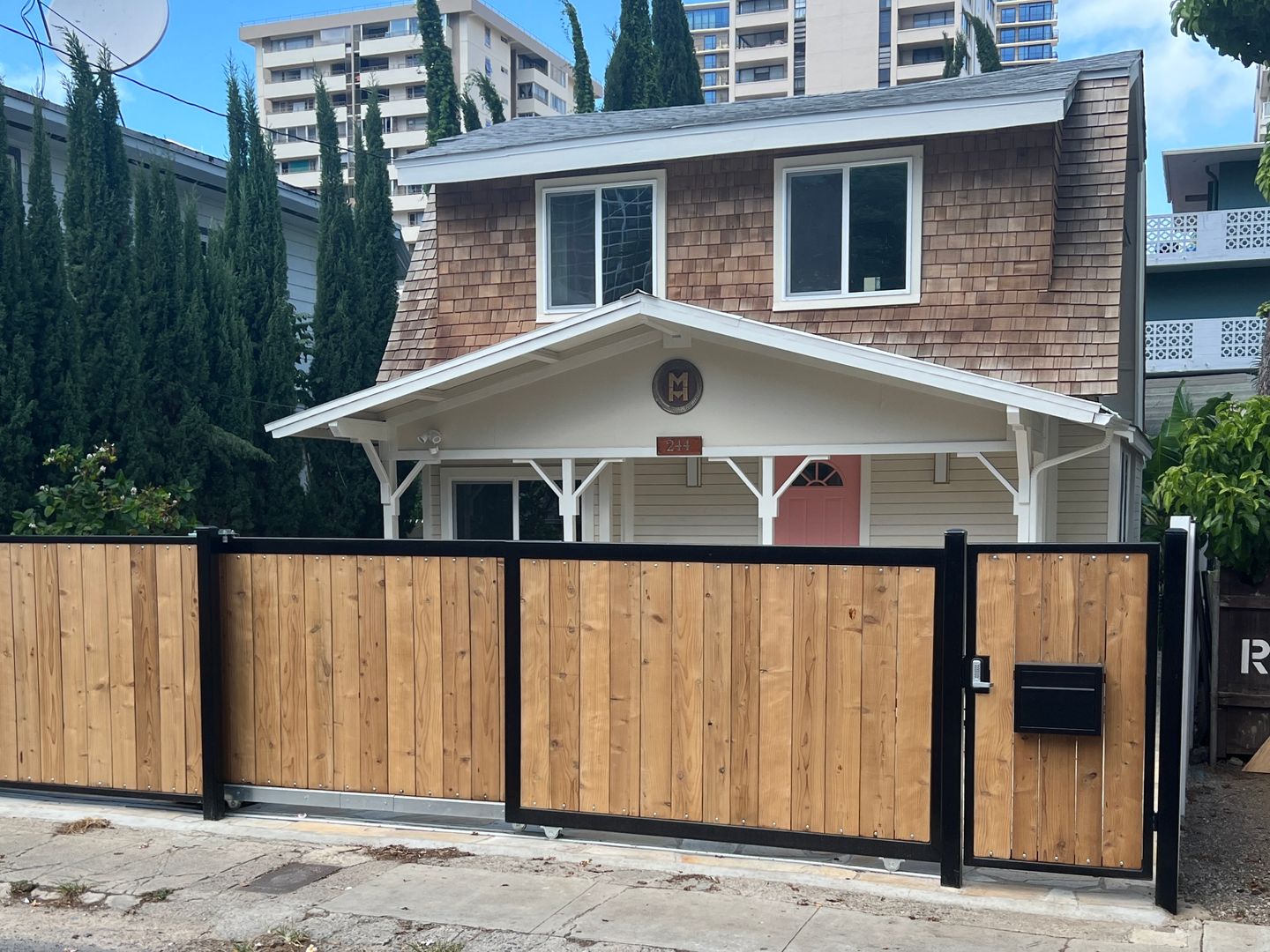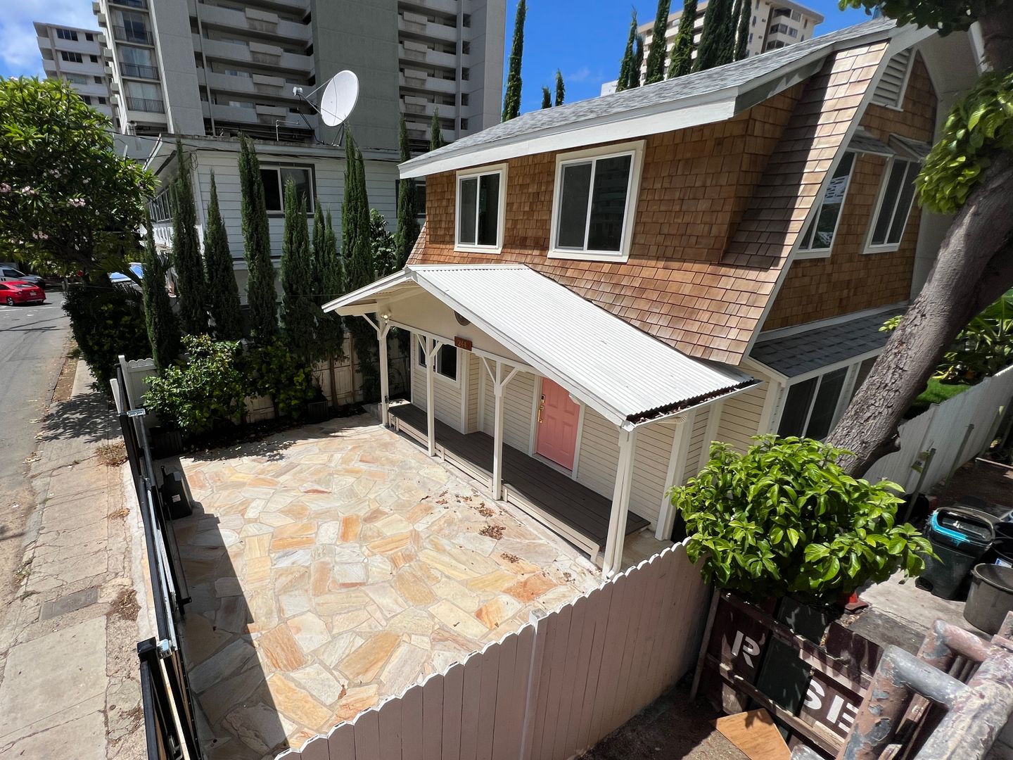 Fully renovated and gated Waikiki two story doll house with covered front and back porch plus a backyard! Charming 3 bedroom 2 bathroom bungalow is a must see with a modern kitchen featuring tons of counter space, solid countertops and brand new appliances. Open concept living room includes a full bathroom downstairs. All 3 bedrooms are on the 2nd floor. Primary bedroom with large closet and views of the city and backyard. New split AC's throughout the home plus a full size washer and dryer. Relax on the beautiful covered rear lanai that overlooks the garden. Theres with trellised bbq area and outdoor surfboard shower. Gated driveway that fits 2 cars. Walking distance to shops, restaurants, and the best part of Waikiki Beach.